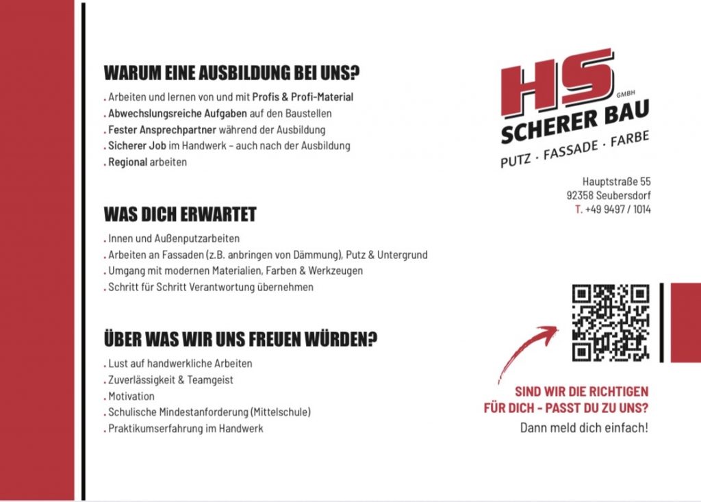 Du bist auf der Suche nach einem Schülerpraktikum und möchtest einen handwerklichen Beruf kennenlernen? Bei Scherer-Bau hast du die Möglichkeit, erste Erfahrungen im Bauhandwerk zu sammeln – als Maler und Lackierer oder Stuckateur. Entdecke, wie spannend das Handwerk sein kann, und lerne die Arbeit auf einer Baustelle hautnah kennen!